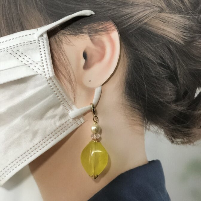 このマスクチャームは、マスクのゴム部分に引っ掛けるタイプになっておりますので、耳元に引っ掛けるとイヤリングをつけている様にも見えます。