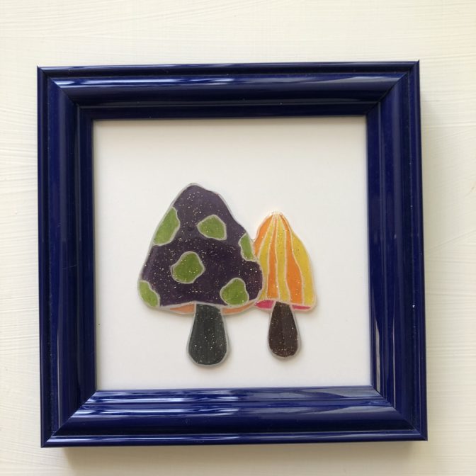 *スクエアのフレームに、「きのこブラザーズ」をプラバンで作って貼り付けています。